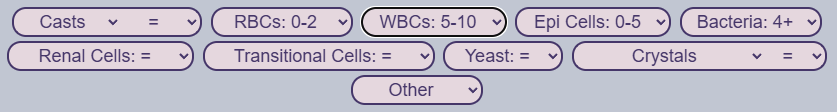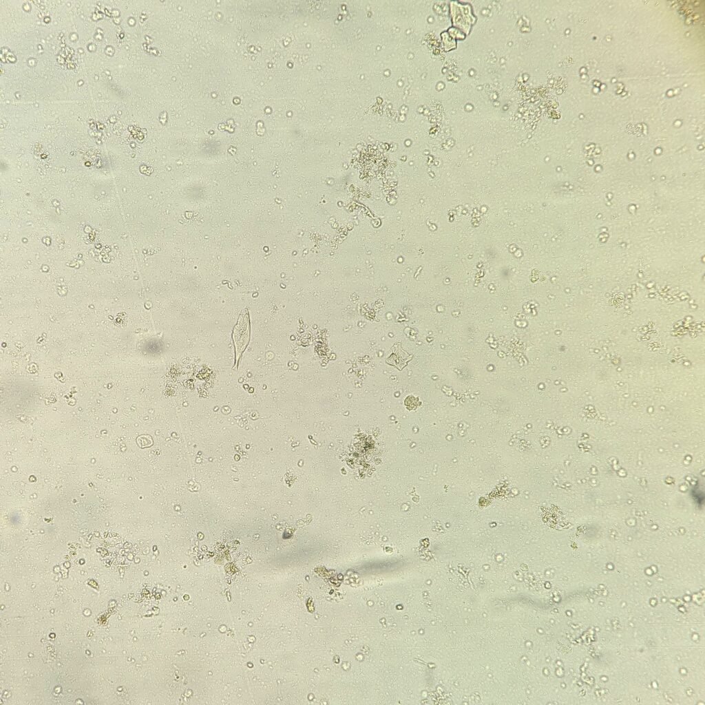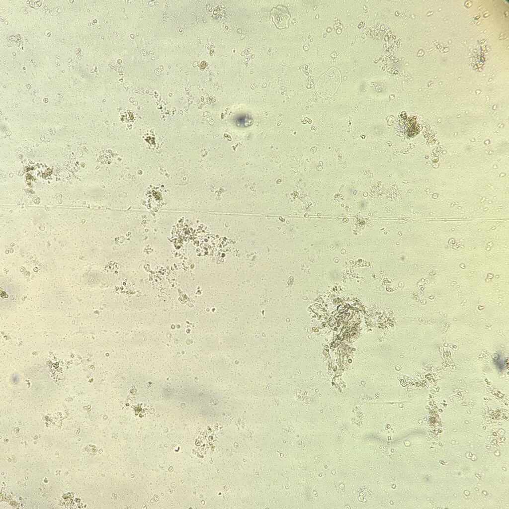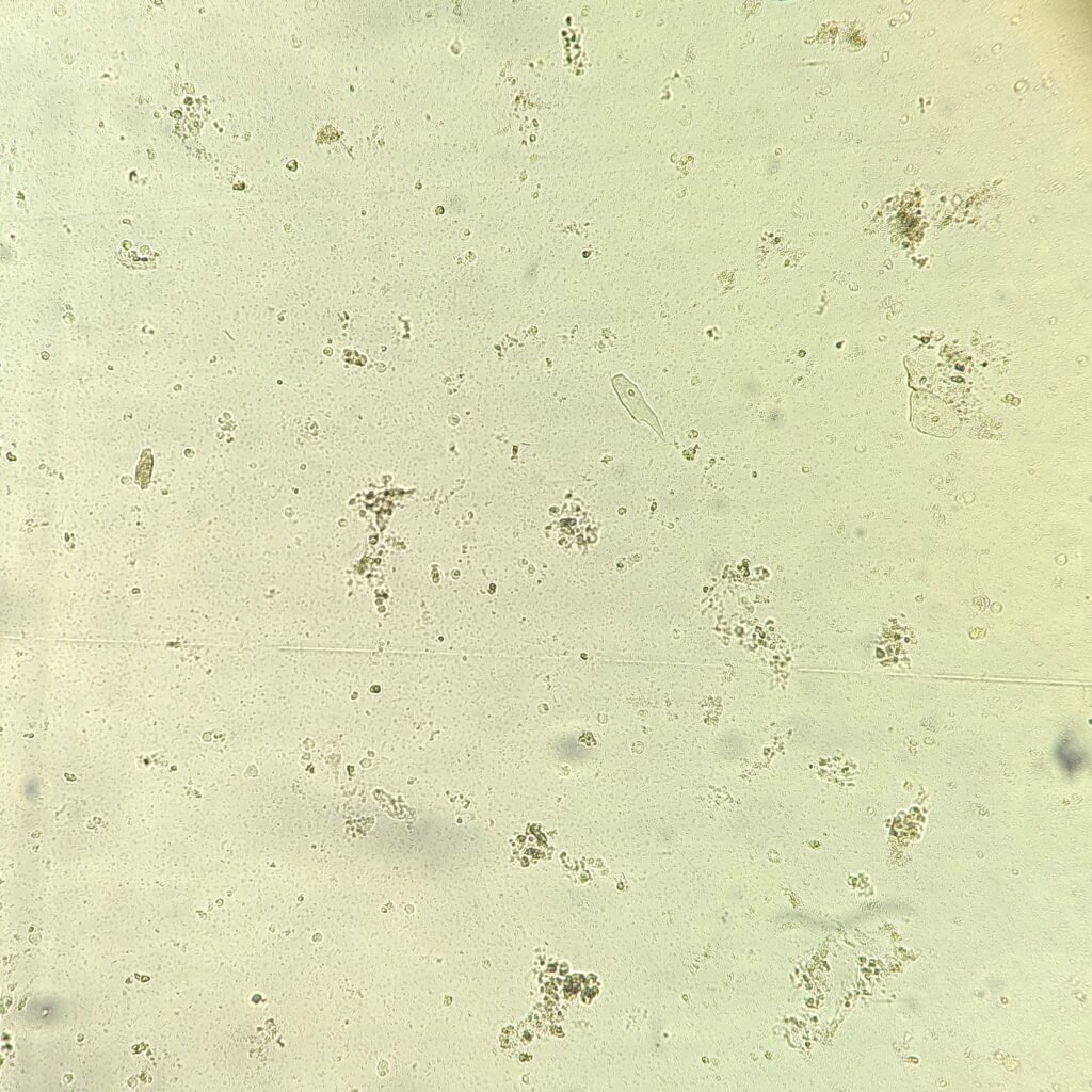 No casts are noted on low power. The bacteria in the urine is immediately evident, filling every field. This puts it at a 4+ and is most likely the cause of the turbidity. The white blood cells are difficult to see through the bacteria, but there are about 5-10 per low power field. This matches the positive leukocyte esterase. The urine chemistries also showed trace blood and a few red blood cells can be seen on the microscopic. It is possible some RBCs lysed as well. Other than that, there is not much else of note.
